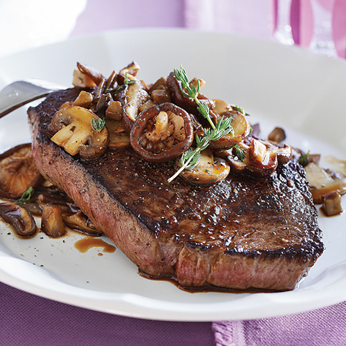 Serve steak with mixed mushroom sauté over top, dividing evenly, and garnish with additional thyme sprigs.