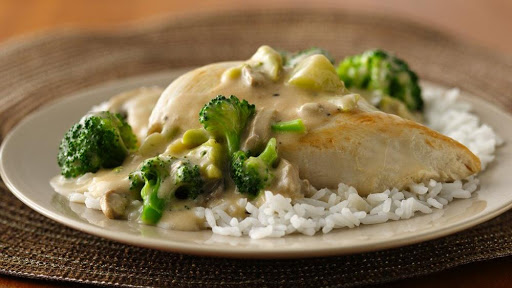 Pour soup over chicken. Place broccoli & cheese around chicken. Sprinkle with thyme and pepper. Reduce heat to medium.