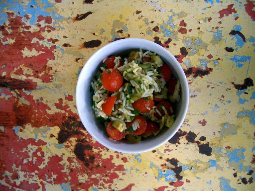 Combine oil, rind, juice, vinegar, salt and pepper in a large bowl; stir with a whisk. Add farro (or whatever grain you want), tomatoes, cucumber, and cilantro; toss gently to coat. Place about 1 cup of mixture on each plate and garnish with avocado. (I just put it all in bowl and ate it with pita bread)