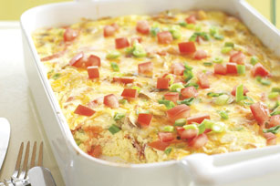Pour into greased 13x9-inch baking dish; top with bacon mixture and cheeses.