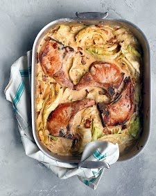 Reduce heat to medium. Add bacon; cook until golden, about 5 minutes. Add onion; cook until softened, 5 minutes. Add cabbage, cut side down, and cook until light golden, about 6 minutes. Flip and cook until slightly tender, about 3 minutes. Add flour and stir until coated. Add milk and cook, stirring constantly, until thickened, about 4 minutes. Season with salt and pepper, then nestle pork chops in sauce. Transfer pan to oven. Bake until pork is cooked through, about 10 minutes.