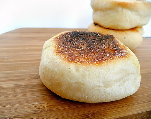 7. Brush the pan or griddle with vegetable oil or mist with spray oil. Uncover the muffin rounds and gently transfer them to the pan, sliding a metal spatula under them and lifting them to the pan. Fill the pan so that the pieces are at least 1 inch apart, not touching. Cover the pieces still on the sheet pan with the plastic wrap or a towel to prevent them from developing a skin. The dough that is being cooked will flatten in the pan and spread slightly, then the pieces will puff somewhat. Cook them for 5 to 8 minutes, or until the bottom of the dough cannot cook any longer without burning. The bottoms should be a rich golden brown; they will brown quickly but will not burn for awhile, so resist the temptation to turn them prematurely or they will fall when you flip them over. Carefully flip the pieces over with the metal spatula and cook on the other side for 5 to 8 minutes in the same manner. Both sides will now be flat. When the dough seems as if it cannot endure any further cooking without burning, transfer the pieces to a sheet pan and place the pan in the oven (don’t wait for the still uncooked pieces, or the ones just out of the pan will cool down and will not respond to the oven stage). Bake for 5 to 8 minutes on the middle shelf in the oven to ensure that the center is baked. Meanwhile, return to the uncooked pieces and cook them, then bake them, as you did the first round.