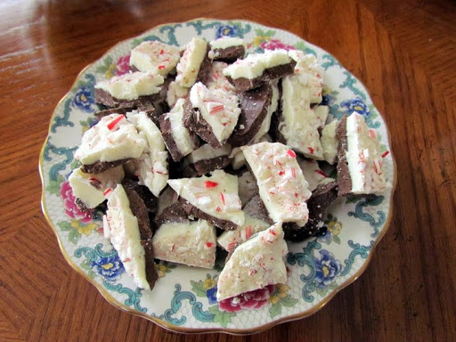 Sprinkle the peppermint candy chunks on to the chocolate and gently press them in with yours hands.