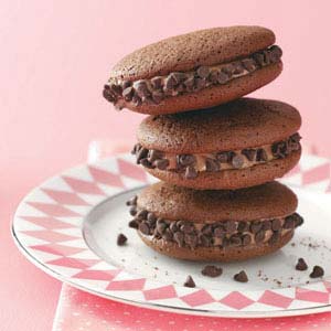 Chocolate lovers will find these cute triple-chocolate goodies irresistible. Two luscious cookies, a yummy mousse-like filling and mini semisweet chips