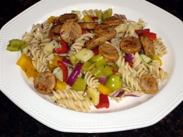 4. In a large bowl, toss the pasta, dressing, chopped provolone, and all the veggies together. Top with the sausage and serve.