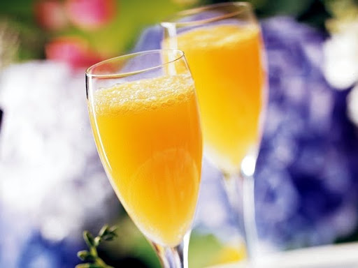2. Pour champagne into glasses until half full. Fill glasses with juice mixture