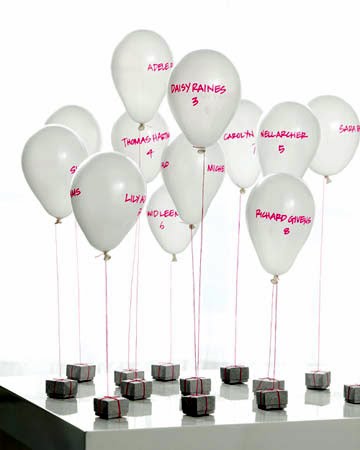 Help your reception take flight with floating escort cards that double as centerpieces once guests find their tables. On your wedding day, have a few friends fill 5-inch white balloons with helium (you can rent a tank from a party store). Once they're inflated, add guests' names and table numbers with a paint pen, tie on matching embroidery thread, and secure them to favor boxes filled with candy. Write on both sides of the balloons so loved ones can locate their names from every angle.