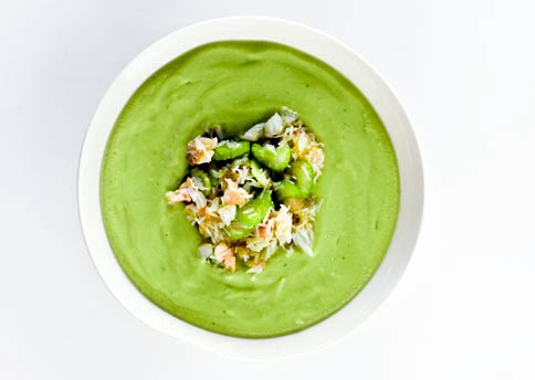 Divide soup among 4 bowls. Spoon crab salad into center of each bowl.