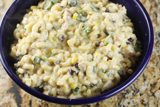 Cook the macaroni according to the package and when it’s done, drain it and add it back to the pot. Then stir in the green chile cheese sauce!
