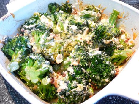 1 Preheat oven to 350º. 2 Cook the broccoli until tender-crisp; drain very well. 3 Put in a greased 2-quart casserole. 4 Mix in the cream cheese, cheddar, green onion, salt, pepper and bacon. 5 Bake for 20-30 minutes, until bubbly.