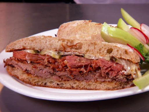 For the sandwich: Slice the ciabatta in half, drizzle the bread with olive oil and toast for 8 to 10 minutes. Then let it sit out for 30 minutes; the staleness of the bread will allow it to hold the juices from the pork and ham.