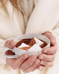 In a small saucepan, combine the coconut milk and sugar and heat, stirring to dissolve the sugar; keep warm. In a medium saucepan, combine the cream and whole milk and bring to a simmer. Add the chocolate chips and remove from the heat. Let stand, stirring occasionally, until the chocolate is melted; whisk until smooth. Pour the chocolate into 8 mugs and spoon some of the coconut milk on top. Garnish with the marshmallows and serve.