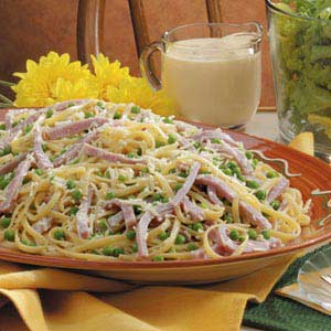 Cook linguine according to package directions. Meanwhile, in a large skillet, saute ham in butter for 3 minutes. Add peas; heat through. Drain linguine; toss with the ham mixture, Parmesan cheese and cream. Serve immediately.