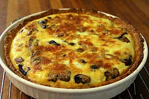 Spread cooked mushrooms in prepared pie crust. Cover with a thin layer of white cheddar cheese. Cover with custard. Bake for 40-50 minutes. When custard is almost set sprinkle with cheddar jack cheese. Bake until lightly browned and custard is completely set. Rest quiche for 5 minutes before cutting.