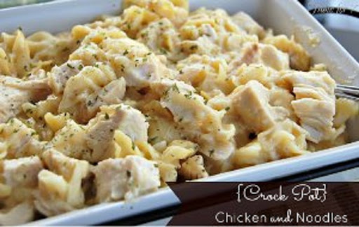 Remove chicken. Cut or shred. Put back into crock pot. Add noodles ( dry pasta, not cooked) and cook an additional hour, stirring occasionally.