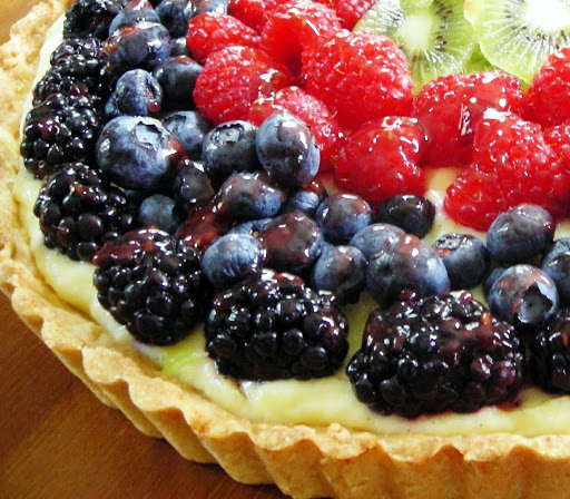 When you are ready to serve your tart, pour the cooled pastry cream (give it a pass or two with a whisk to incorporate it again) into the tart shell. Add fruits of your choice (I find that berries or fruit that isn't too juicy works the best) over the top. If you want a glaze, use about 1/3 cup of jelly of your choice and one teaspoon of water, boil it, let it cool, and using a pastry brush "paint" your fruit.