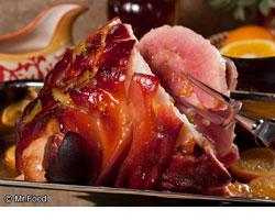 With a sharp knife, cut a diamond pattern into skin of ham and place in a large roasting pan. Place orange slices around ham.