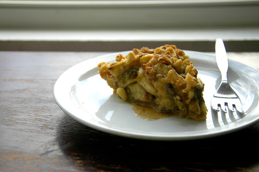 Bake the pie: Make a crust shield by wrapping aluminum foil around the outer edge of the crust. This is really important, otherwise the crust will burn quite badly. Bake 30-45 minutes at 375ºF, until apples are firm but cooked through (check with a fork). If the streusel gets too brown (I didn’t have this problem), the pie can be covered in foil to finish baking.