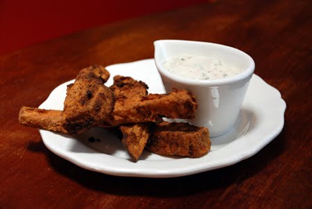 Working in batches, fry eggplant, turning occasionally, until golden brown, 3-4 minutes per batch. (Reheat oil to 325° between batches.) Transfer to paper towels to drain. Season with lemon juice and sea salt. Serve immediately with dipping sauce.