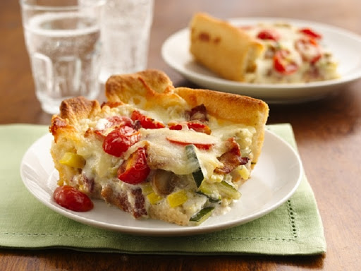 Spray 11x7-inch (2-quart) glass baking dish with cooking spray. Unroll dough in baking dish; press in bottom and up sides of dish. Bake 5 minutes. Meanwhile, in reserved skillet, add remaining 1 tablespoon bacon drippings, the zucchini, yellow squash, mushrooms, pepper and remaining 1/4 teaspoon garlic powder; toss to coat with drippings. Cook and stir over medium-high heat 3 to 5 minutes or until vegetables are crisp-tender. Stir in bacon.