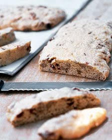 In an electric mixer fitted with the paddle attachment, combine baking powder, flour, sugar, and salt. In a bowl, beat eggs, yolks, and vanilla. Add to dry ingredients; mix on medium low until sticky dough is formed. Stir in pecans, cranberries, and zest.