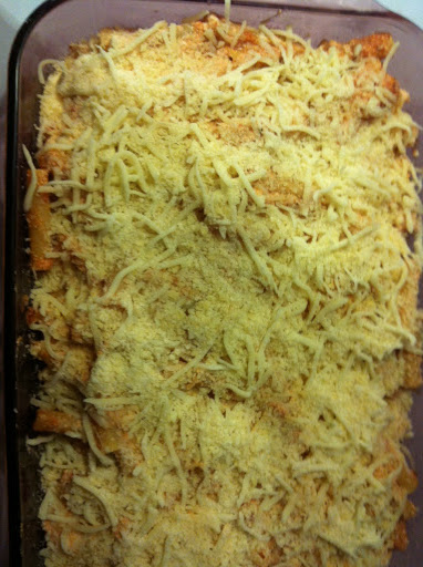 3.Add the sauce to the ziti in the pot and stir to coat it thoroughly. Add the ricotta in large dollops and stir gently, leaving it in large clumps. Pour half of the ziti into a 9-by-13-inch baking dish and top with half of the mozzarella and Parmigiano. Repeat with the remaining ziti and cheeses.