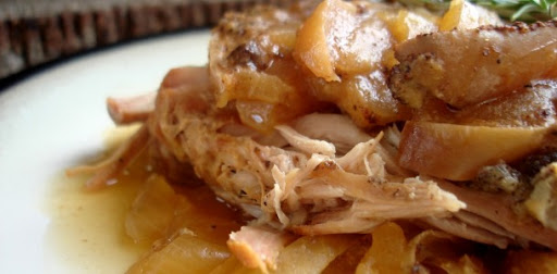 Add your broth or water, then onions, then pork, then apples then all your spices/garlic clove/and bay leaf.
