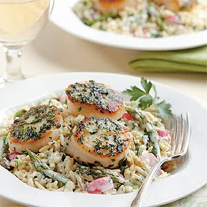 For the scallops, combine 2 Tbsp. tarragon and 2 Tbsp. parsley in a shallow dish. Dip both sides of scallops into minced herbs.