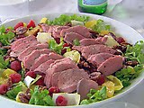 For the salad, trim the bottom half-inch from the endive and cut them diagonally into 1/2-inch slices. Separate the leaves and discard the cores. Place the slices in a large salad bowl. Add the mache leaves, oranges, raspberries, and toasted pecans. Toss with enough dressing to moisten. Gently toss in the warm duck meat and serve immediately.