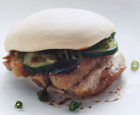 2. Brush bottom half of each bun with hoisin sauce, then sandwich with 2 or 3 pork slices and some cucumber and scallions.