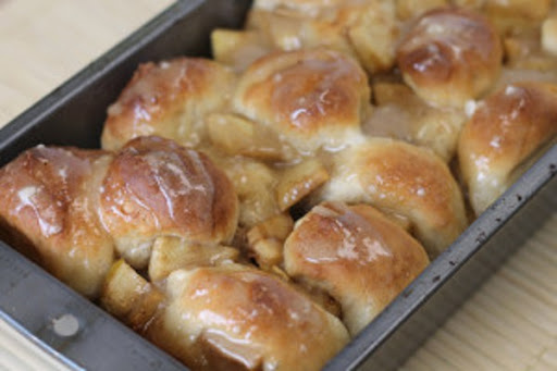 Drizzle half of the remaining melted butter over the rolls. Cover with half of the apple mixture, and repeat layers until the ingredients are used up.
