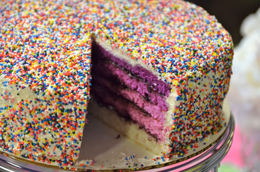 6. Divide mixture evenly into 5 medium bowls (about 300g or 3/4 cup per bowl). Leave one bowl of batter white, then very gradually add purple coloring to each bowl. Gently mix color into the batter, adding slightly more coloring to each bowl to try to achieve an even gradient of color.