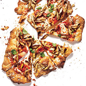 4. Turn dough out onto a lightly floured surface. Roll dough out to a thin 14-inch circle. Transfer dough to a baking sheet dusted with cornmeal. Brush the dough with 1 teaspoon oil. Slide dough onto the preheated pizza stone, using a spatula as a guide. Reduce oven temperature to 475°; bake 5 minutes. Remove from oven. Spread sauce over crust, leaving a 1/2-inch border; top with mozzarella cheese, mushroom mixture, and Parmigiano. Bake 4 minutes or until crust is browned. Slice pizza into 8 wedges.