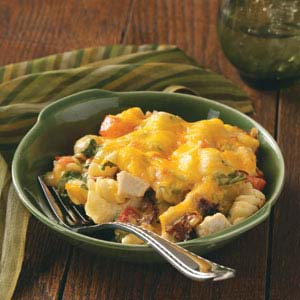 Drain pasta; stir into chicken mixture. Transfer to two greased 8 inch square baking dishes. Sprinkle with cheese.