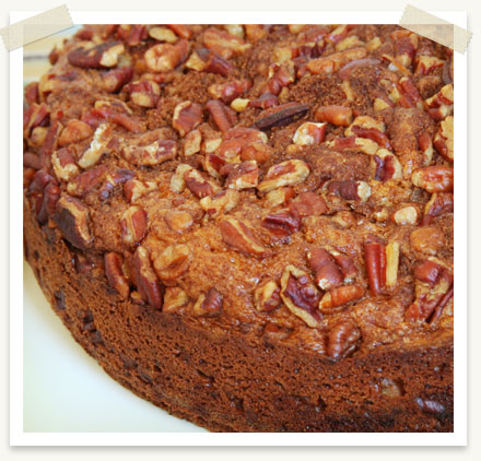 Combine the pecans, cinnamon, and brown sugar and sprinkle half over the mixture in the pan. Top with the second half of the cake mixture and sprinkle with the remaining pecan, cinnamon, and sugar combination.