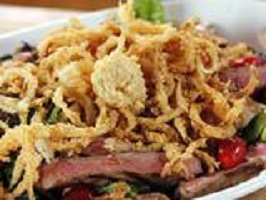 Heap the salad on a plate, making sure to get plenty of blue cheese and tomatoes on each plate. Add half a steak to the top of each plate, then top the steak with onion strings.