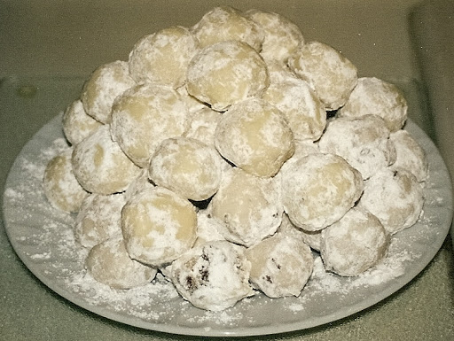 Cream Butter, sugar and van together till fluffy. Sift in flour and salt mix in nuts and chill dough. Roll into 1 " balls and place on cookie un greased cookie sheet they do not spread. Bake 10 to 12 minutes at 450 until set DO NOT BROWN while still warm roll in confectionary sugar.