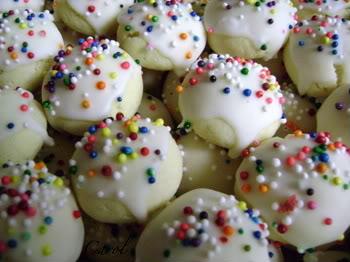 Mix milk GRADUALLY into confectioners' sugar to make a thick glaze...make sure to keep it on the thick side. Dip top of each cookie into glaze. Sprinkle with colored jimmies or nonpareils while glaze is still wet. (I usually dip 10-12 cookies, return them to the wire rack (with wax paper under the racks to aid in clean up) and then sprinkle those cookies before starting to dip more.) Makes a lot of cookies, depending on how large you roll them.