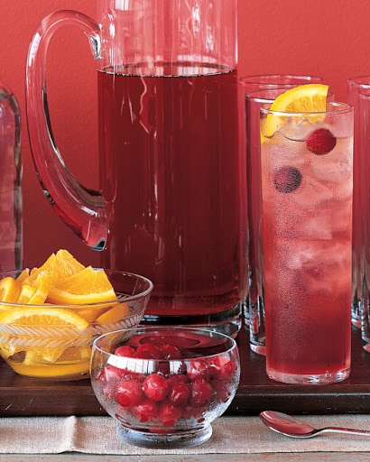 Fill a large pitcher with ice. Pour in all ingredients except cranberries; stir vigorously. Strain into glasses, discarding ice. Garnish with berries.
