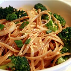 2.Meanwhile, place a saucepan over medium-high heat. Stir in garlic, sugar, oil, vinegar, soy sauce, sesame oil, and chili sauce. Bring to a boil, stirring constantly, until sugar dissolves. Pour sauce over linguine, and toss to coat. Garnish with green onions and sesame seeds.