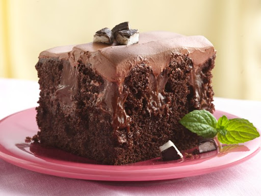3 Stir 1/4 teaspoon peppermint extract into frosting. Spread frosting over top of cake. Sprinkle with peppermint patties. Store covered in refrigerator