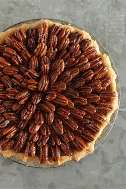 4. Place pecan halves in a spiral pattern on top of pie. Pour warm caramel over pecans. Cool 15 minutes; sprinkle with sea salt just before serving. Note: We tested with Hershey's 100% Cacao Special Dark Cocoa and Maldon Sea Salt Flakes.