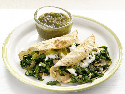 Warm the tortillas in a dry skillet or wrap in a damp towel and microwave 1 to 2 minutes. Divide the spinach mixture among the tortillas, top with the ricotta mixture and a spoonful of salsa verde and fold. Serve with more salsa.