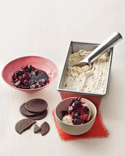 to harden and semifreddo is very cold, at least 50 minutes. Scoop into 4 serving dishes. Spoon cherry-port sauce over tops. Serve with chocolate wafer cookies.