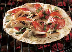 2. On ungreased cookie sheets, place tortillas. Brush with remaining oil mixture. Cut chicken into strips. Arrange chicken strips over tortillas. Sprinkle each with 1/4 cup of the cheese. Top evenly with tomato slices; sprinkle with remaining cheese and basil.