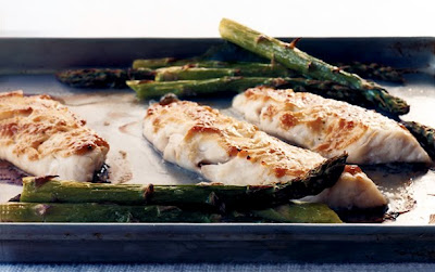 Arrange fish, skin sides down, in baking pan and spread miso mixture evenly on top. Arrange asparagus in 1 layer around fish and broil 5 to 6 inches from heat until fish is just cooked through and asparagus is crisp-tender, 8 to 12 minutes.