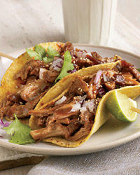 Make Ahead The shredded braised turkey can be refrigerated in the sauce for up to 2 days. Reheat gently. Notes Two Tacos 456 cal, 32 gm carb, 16 gm fat, 3.8 gm sat fat, 38 gm protein, 4 gm fiber.