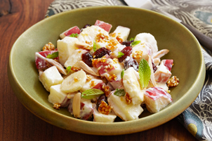 MIX sour cream, powdered sugar and dressing in large bowl until well blended. Add apples, bananas, nuts and half the sesame seed; mix lightly.