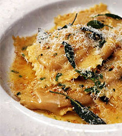 Make sauce. Add the butter to a saucepan over high heat; as it begins to melt, add the sage leaves and almonds. Allow the butter to brown. Squeeze in the lemon juice and add a ladleful of pasta water. Add the Parmesan cheese. Using a slotted spoon, scoop the ravioli from the water and place directly into sauce, tossing to coat. Transfer the ravioli to plates and finish with a drizzle of extra-virgin olive oil and a sprinkle of Parmesan cheese.