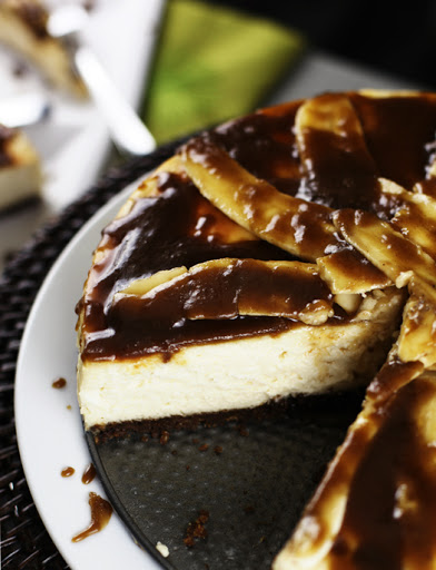 Cook remaining butter, dark brown sugar, rum and cinnamon in small saucepan on low heat 10 min. or until butter is melted and sauce is thickened; cool 10 min., stirring occasionally. Slice remaining bananas just before serving cheesecake; arrange on cheesecake. Drizzle with sauce.